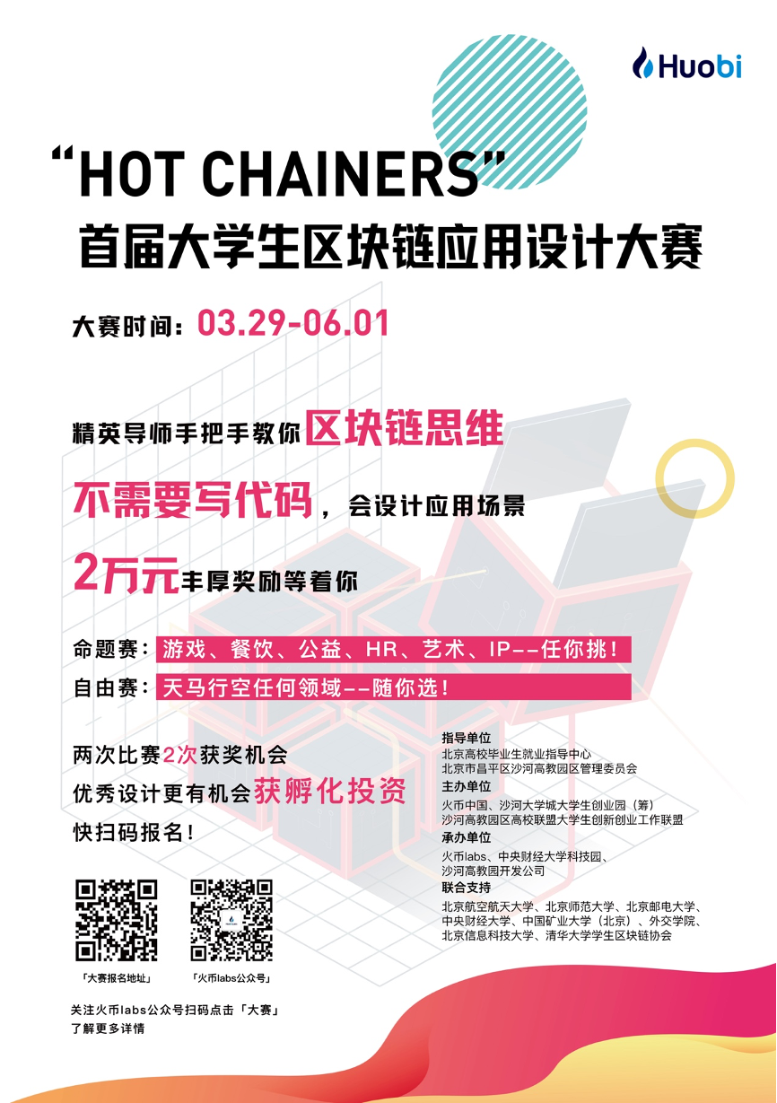 大赛是由北京高校毕业生就业指导中心、沙河高教园区管理委员会作为指导单位;bt365体育官网科技园、沙河高教园开发公司、火币Labs共同承办;北京航空航天大学、北京师范大学、北京邮电大学、bt365体育官网、中国矿业大学(北京)、外交学院、北京信息科技大学、清华大学学生区块链协会等单位联合支持。大赛报名可通过微信公众号“区块链创新工场”-“大赛”栏目报名参与。