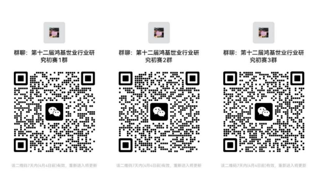 大赛微信群:以下二维码为第十二届鸿基世业行业研究大赛参赛群,请有意向参赛的同学扫码入群,入群请备注专业-年级-姓名。