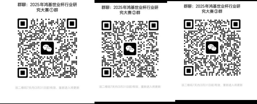 大赛微信群:以下二维码为“鸿基世业杯”沙河高教园区首届暨356体育官方网站第十三届行业研究大赛初赛参赛群,请有意向参赛的同学扫码入群,入群请备注学校-专业-年级-姓名。
