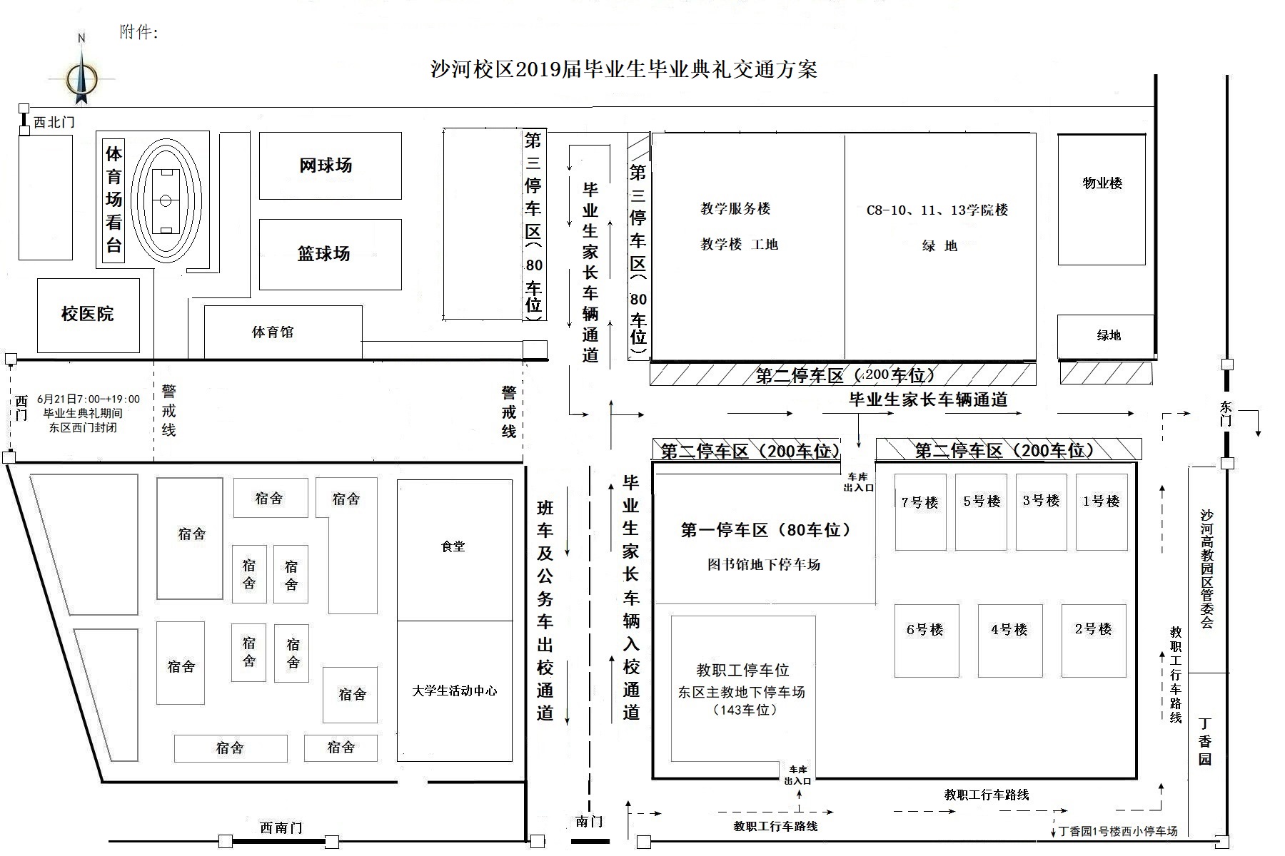 1.6月21日(周五)7时至19时,东区西门机动车道出、入口临时封闭,禁止车辆通行。入校车辆请一律从东区南门进入,东区东门驶出。