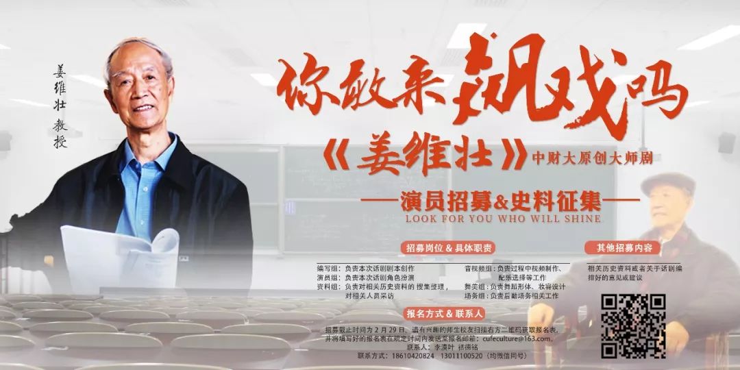 为了纪念姜维壮先生,表达对老一辈教育工作者的尊敬和怀念,学校决定,由校党委宣传部牵头,联合财税学院、校团委等单位,联合排演我校原创大师剧《姜维壮》。